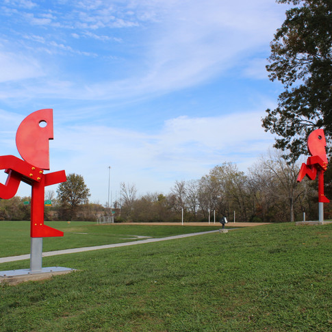 The City of Leawood commissioned Blanco to create works to celebrate the athletic endeavors that take place at Leawood City Park. This work and its companion piece, "For the Goal," are the results of that commission. "Run Red Run" is towards the east end of Leawood City Park near one of the park shelters there and the soccer field. It represents the sheer joy of children running around while playing. When the two sculptures were unveiled, the children participating in Leawood's spring soccer program participated in naming the sculptures.